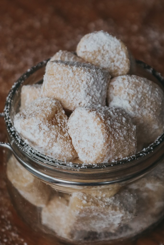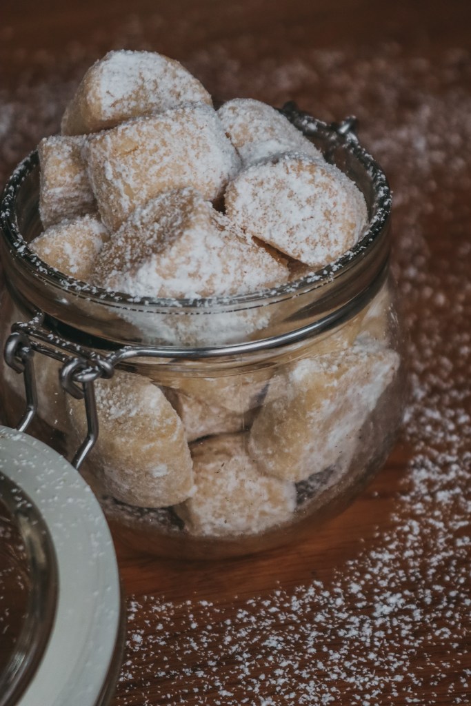 Alle Zutaten zu einem gleichmäßigen Teig verkneten und den Teig für 1 Stunde kühl stellen. Den Backofen auf 180 Grad Ober- und Unterhitze vorheizen. Den Teig in 5 Portionen teilen und jeden Teigling zu einer 1-2cm dicken Rolle ausrollen und diese Rolle in 2-3cm lange Stücke schneiden. Im Backofen ca. 12 Minuten backen, auskühlen lassen und anschließend in Puderzucker wälzen.