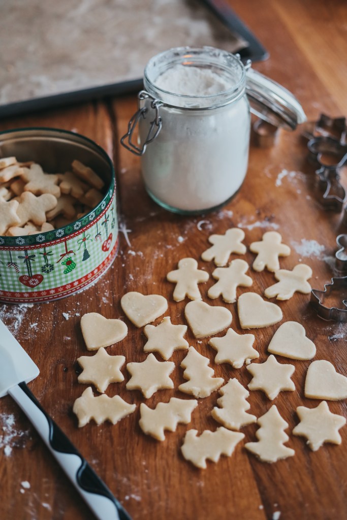 Alle Zutaten in eine Rührschüssel geben und zu einem gleichmäßigen Teig verkneten. Eine große Kugel aus dem Teig formen und eine halbe Stunde kühl stellen, denn dann lässt sich der Teig besser verbreiten. Backofen auf 180 Grad Ober- und Unterhitze vorheizen und die Plätzchen anschließend 10 Minuten backen. Sie sollten noch leicht weich sein, wenn ihr sie aus dem Ofen holt, da sie ansonsten viel zu hart werden, wenn sie ausgekühlt sind.